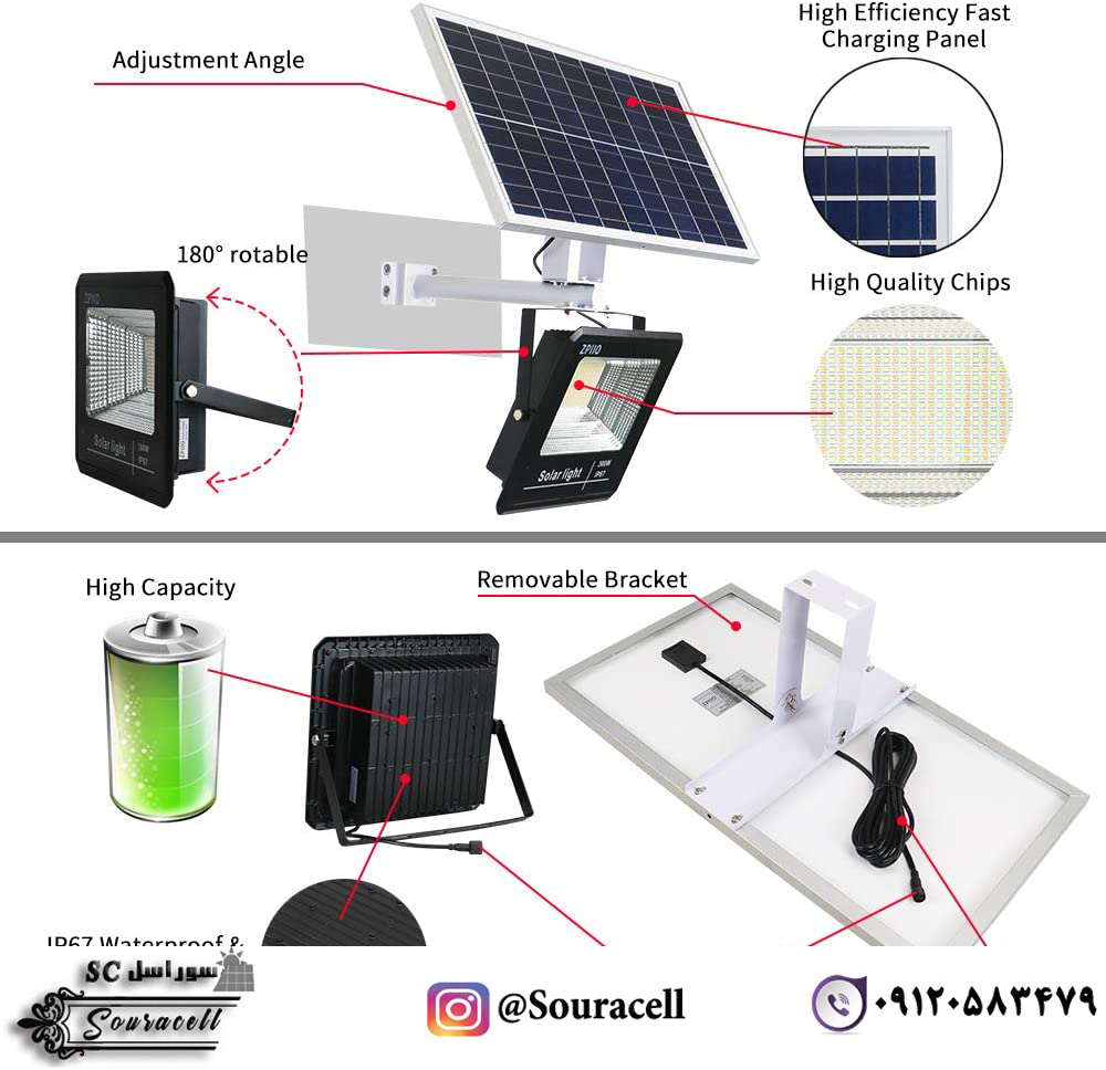 پروژکتور های سولار طوری ساخته می شوند که پنل خورشیدی با کابل 4 متری به نورافکن متصل می شود و بنابراین امکان استفاده از این محصولات در محوطه های باز و همچنین محوطه های بسته مهیا می شود.